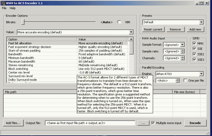 ist eine GUI zum Aften A/52 Audio Encoder, der Mono-Files nach AC3 konvertiert.