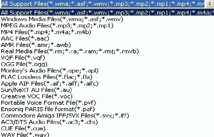 WMA, MP3, AAC, M4A(MP4 Audio), AMR(AWB), VQF, OGG, FLAC, APE,
