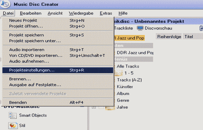 Projekteinstellungen der DVD
