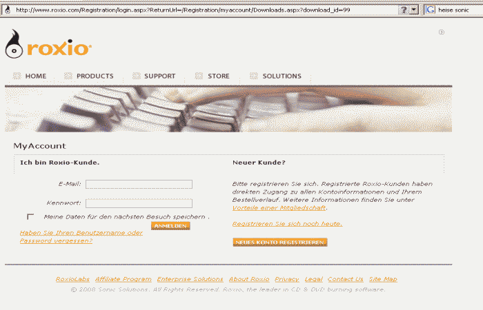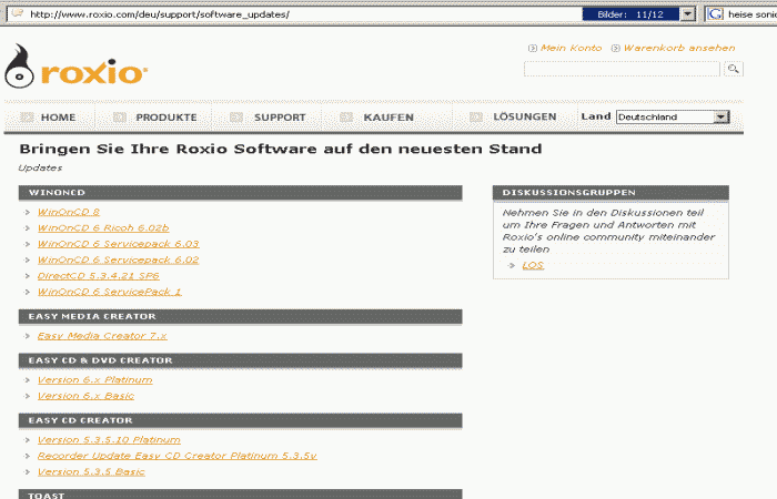 Roxio-Webseite deutsch offeriert Update-Möglichkeiten nur bis Version 8