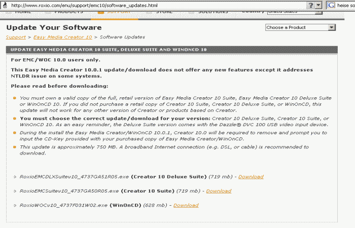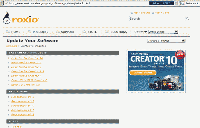 Roxio-Webseite USA offeriert Update-Möglichkeiten bis Version 10