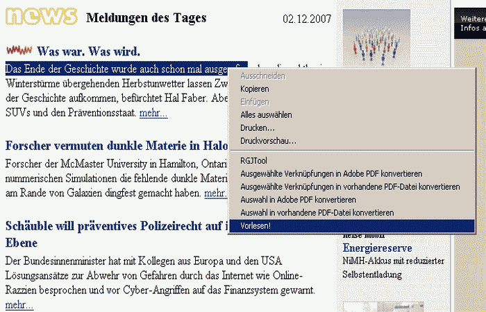 Eine gesamte Webseite kann vorgelesen und zugleich als WAVE oder MP3 gespeichert werden.