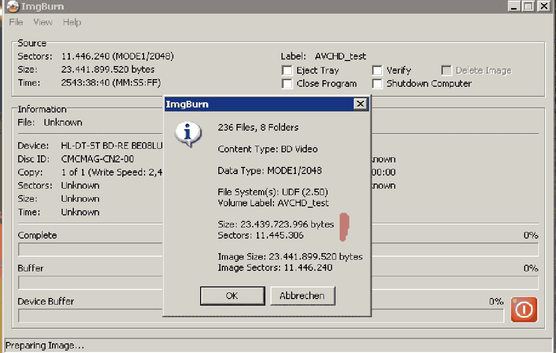 Die erzeugte BD brennen per ImgBurn - fast 24 GBytes, das ist der Gesamtbedarf der BD !