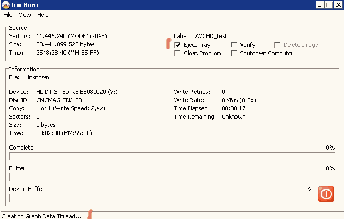 Die erzeugte BD brennen per ImgBurn - Brenngeschwindigkeit muss realistisch sein.