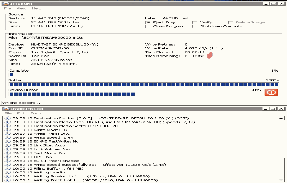 Die erzeugte BD brennen per ImgBurn - brennen aktiv.