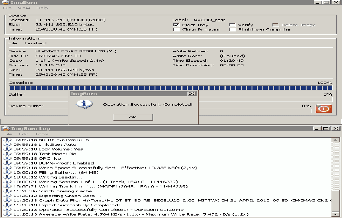Die erzeugte BD brennen per ImgBurn - fertig bei 2,4 x Brennspeed, Dauer leider ellen lang.