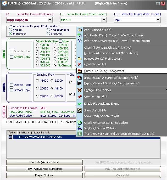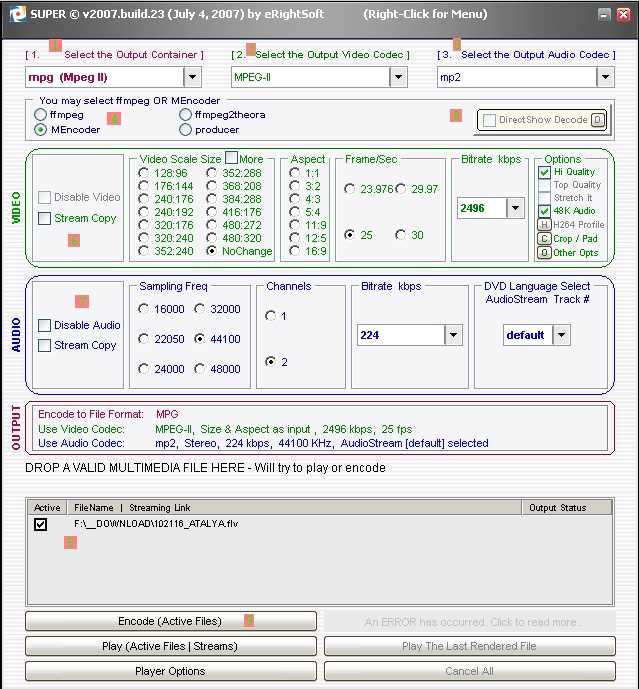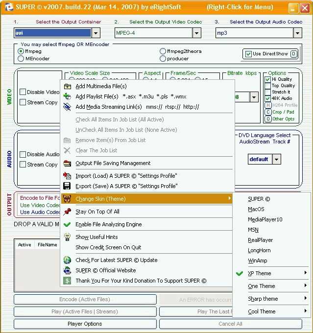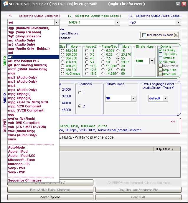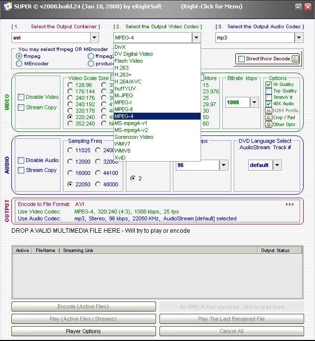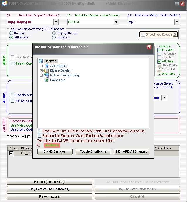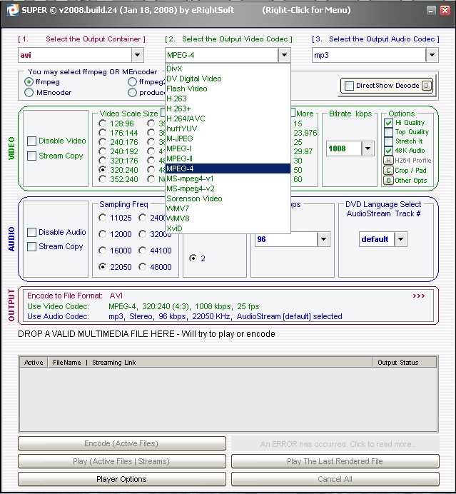 Mögliche Video-Codecs zum Ausgabe-Format (Grün) SuperC bietet nur zum Ausgabe-Format passende Codecs an.