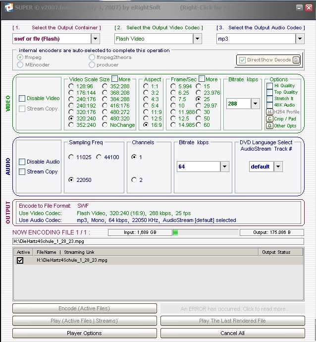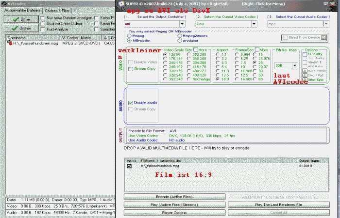 Beispiel: mpg mit 16:9 zu AVI als DivX mit 16:9 und mit Verkleinerung der Bilddimension, ohne Ton