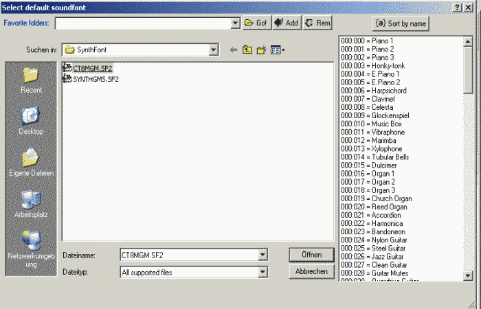 Man beachte beim Anwählen der SoundFont-Datei die Anzeige der Instrumente, die
