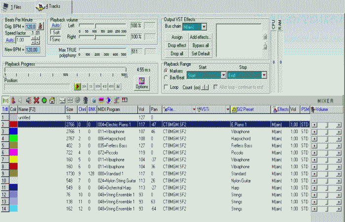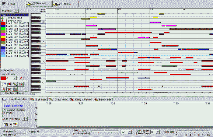 Die Tracks (Spuren, Kanäle) der MIDI-Datei sind farbig hinterlegt.