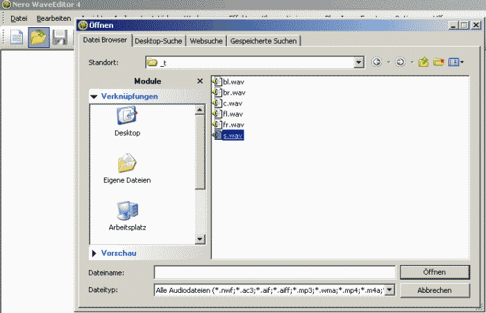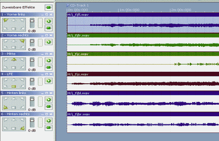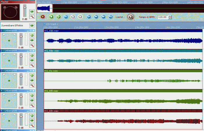 Alle bisher erzeugten Mono-Waves (bl.wav, br.wav, fl.wav, fr.wav, c.wav) importieren